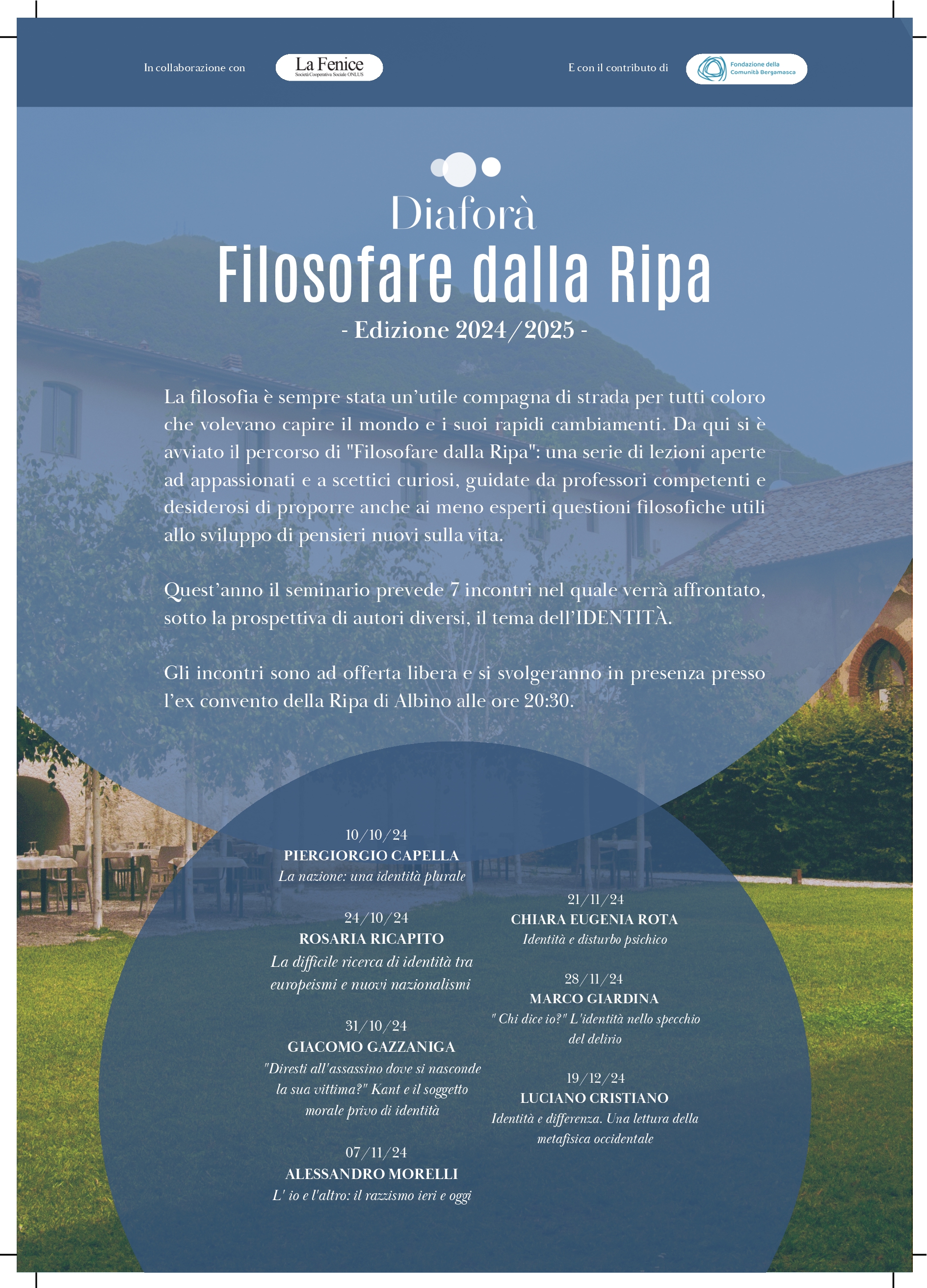Gli incontri verteranno sul tema dell’identità, declinato secondo differenti punti di attenzione. La prima parte prevede un’esposizione a cura del docente, in seguito è previsto uno spazio per le domande e gli approfondimenti.